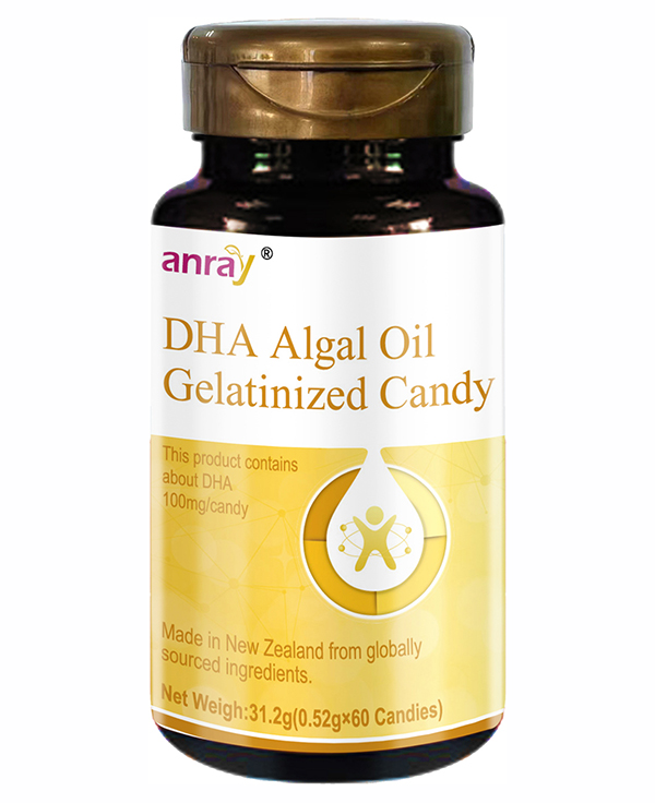 本品添加DHA藻油。每顆糖果DHA含量100毫克,DHA藻油推薦食用量≤300毫克/天(以純DHA計(jì))