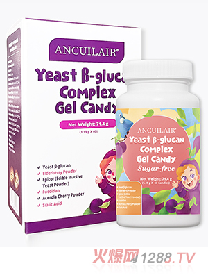 安萃萊酵母β-葡聚糖凝膠糖果(無糖型)葡聚糖每粒含量高達(dá)200毫克,是市面上產(chǎn)品的7倍,接骨木莓含量40毫克,唾液酸、巖藻多糖、VC、EPICOR等成份。