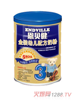 恩貝健金裝兒童成長(zhǎng)奶粉由恩貝健營(yíng)養(yǎng)品研究中心根據(jù)中國(guó)兒童生長(zhǎng)發(fā)育需求,最新研制的為3~7歲兒童食用的兒童成長(zhǎng)奶粉。產(chǎn)品參照世界衛(wèi)生組織(WHO)、國(guó)際標(biāo)準(zhǔn)化組織(ISO)、國(guó)際乳品聯(lián)合會(huì)(IDF)和中國(guó)國(guó)家相關(guān)的標(biāo)準(zhǔn)要求設(shè)計(jì),特別添加了FOS低聚果糖(益生元)和二十二碳六烯酸DHA、花生四烯酸ARA;同時(shí)添加了膽堿、;撬、鈣、鐵、鋅等多種營(yíng)養(yǎng)物質(zhì),對(duì)處于旺盛生長(zhǎng)發(fā)育期的兒童提供全面、合理、均衡的營(yíng)養(yǎng)呵護(hù)。